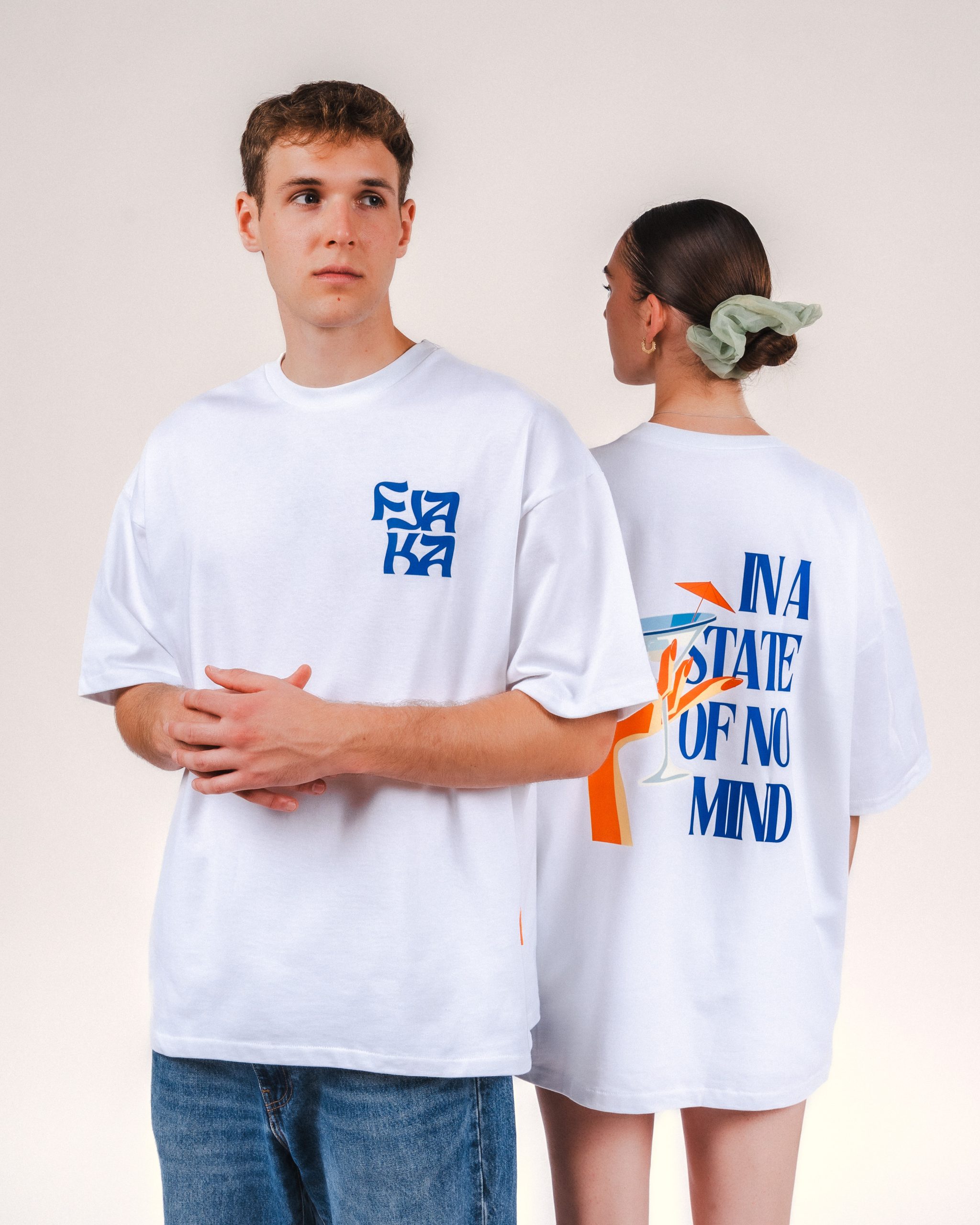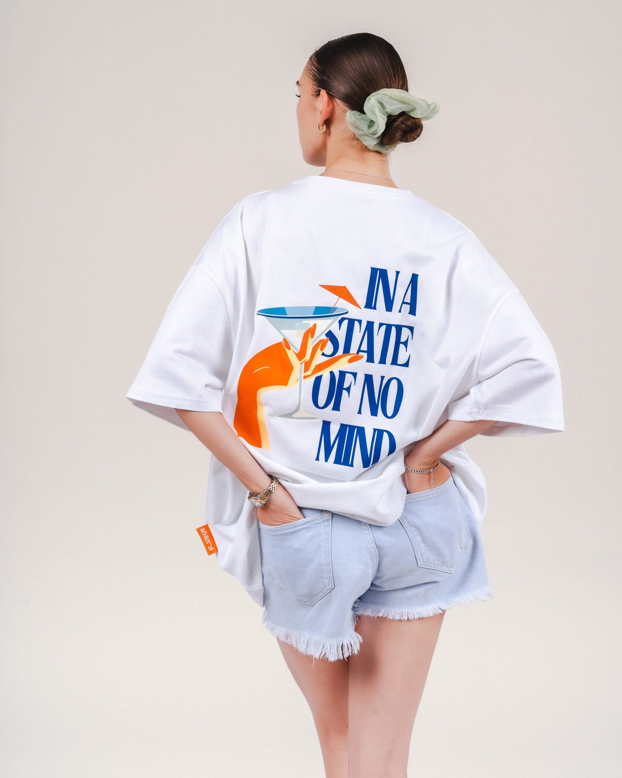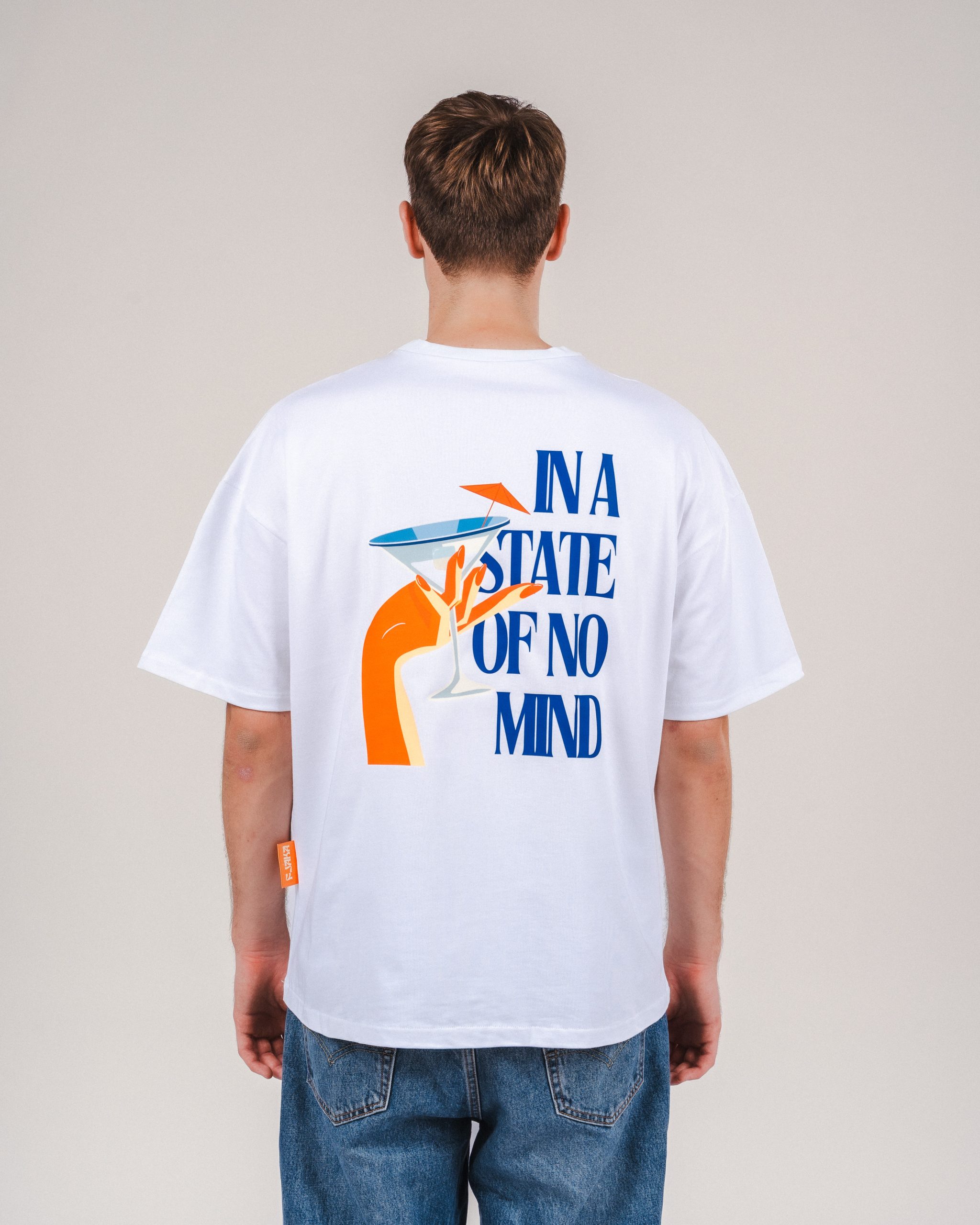 White oversized In A state of No Mind T shirt promoting our brand and our way of living. Finding pleasure in simple things like sipping a cocktail on sunny day by the sea depicted by the blue and orange prints on our T Shirt.